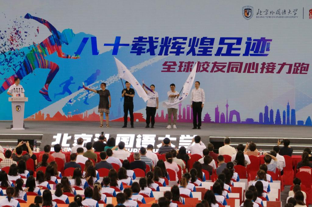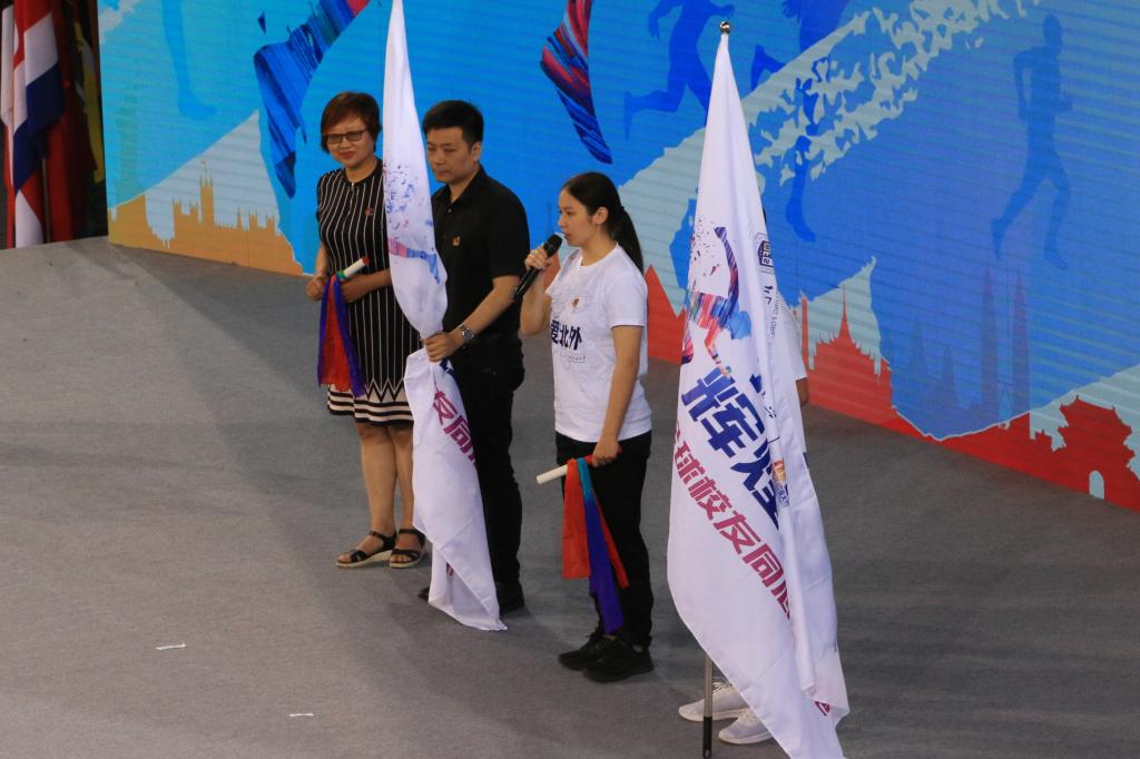 捐赠仪式后,党委副书记、副校长贾文键及众多知名校友共同启动“八十载辉煌足迹,全球校友同心接力跑”活动。365完美体育卓悦同学作为留学生代表参与传递接力棒、接力旗环节。