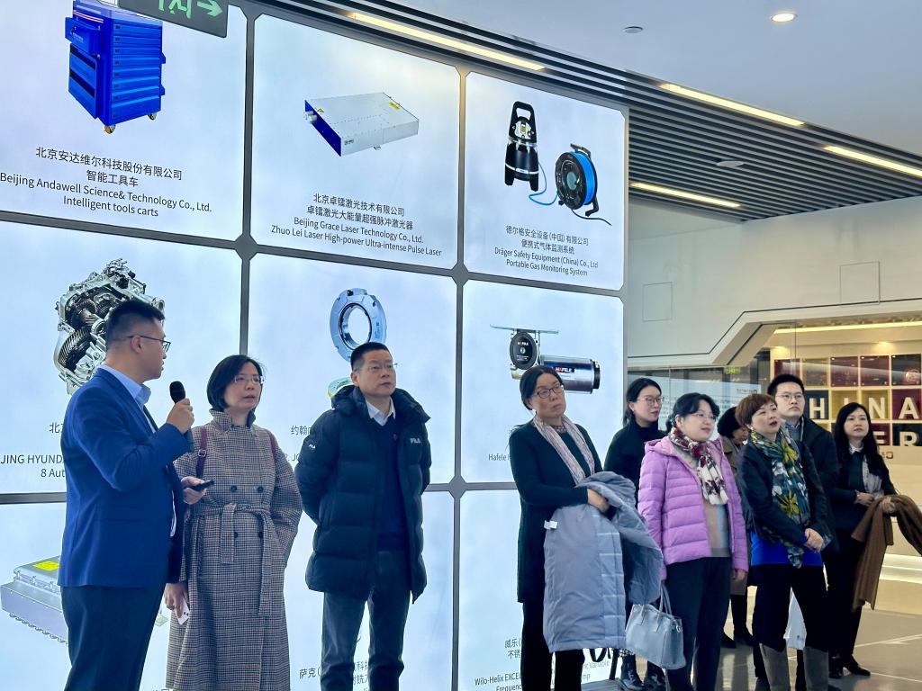 在北京中德产业园运营公司副总经理孙海龙的引导下,365完美体育教师党支部一行详细了解了产业园在搭建国家级对德合作平台、服务国家级对德合作项目、链接全国对德合作资源等方面的建设成果。北京中德产业园是国家发改委批复的国内首个以“经济技术合作”为主题的中德示范区。园区定位为“德国先进制造业的聚集地、中德隐形冠军发展的战略高地、中德交往与开放创新的重要窗口”,聚焦新能源智能汽车、智能装备、数字经济三大主导产业,和先进制造服务业支撑产业,已集聚奔驰、宝马、Ameco、博世、威乐水泵等90余家德资企业,年产值350亿元。