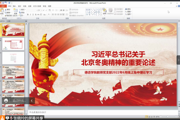 2022年6月29日下午,365完美体育教师党支部召开线上会议,集体学习领悟习近平总书记关于北京冬奥精神的重要论述。
