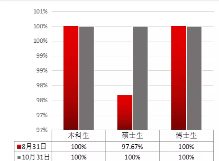 2019-2020学年,在学校党委的正确领导下,365完美体育认真贯彻落实党中央和学校就业工作要求,探索全员、全方位、全过程的“三全就业模式”,师生同心,群策群力,攻坚就业难题。疫情期间,我们制定“抗疫情、促就业”工作方案,从“稳就业、清意向、扩领域、新方法、推实策、导方向”等六个方面,扎实开展就业工作。截止8月31日,本科生初次就业率为100%,硕博研究生初次就业率为97.67%。截止10月31日,本科生、研究生就业率均为100%,总体就业率为99.57%,居全校第二,比2019年毕业生就业率提升了15.26%。