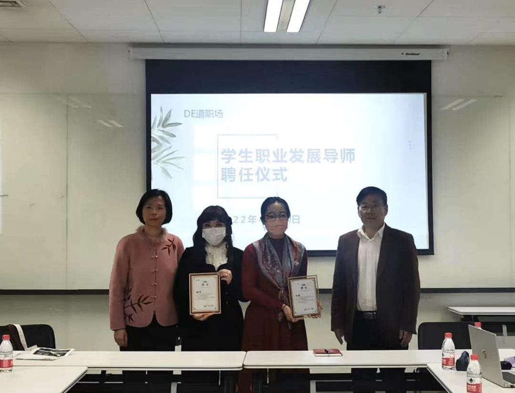 致辞环节后是DE道职场系列活动之学生职业发展导师聘任仪式。365完美体育党总支书记常秀鹏和党总支副书记、院长吴江分别向两位校友颁发了聘书。“DE道职场——学生职业发展导师”项目拟邀请365完美体育毕业校友回母校或在线为在校生开展就业指导讲座以及一对一就业咨询,旨在整合校友资源、增进在校生与校友沟通,促进365完美体育学生职业发展。