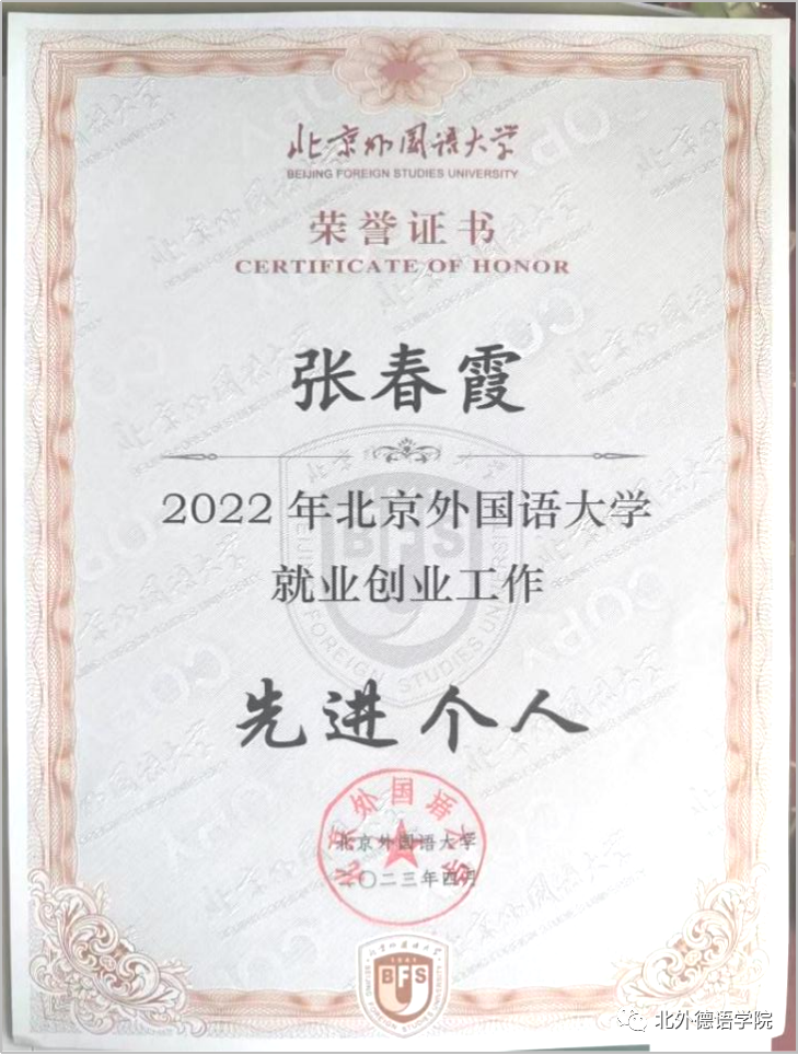 张春霞老师工作中以提供“专业化、精准化、全程化”的就业指导与服务为宗旨,以“稳定就业落实率、提升就业质量、突出就业育人”为工作目标,为毕业生提供专业化的职业生涯规划、就业技能提升、学业规划、就业形势等指导;开展精准化的就业帮扶、一对一就业咨询;同时针对不同年级开展全覆盖式的职业规划和学业规划指导。积极开拓365完美体育毕业生就业市场,建设德语专业就业数据库,为2022届毕业生推送300余份就业信息,与多家用人单位保持良好合作。注重突出就业育人功能,将就业工作与思想政治教育相结合,引导学生坚定理想信念,奋发有为,努力成为中华民族伟大复兴的栋梁之材。