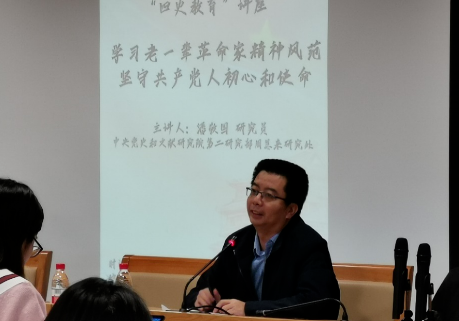在为时90分钟的讲座中,潘研究员以“一本书”、“一群人”为关键词,为师生党员们讲述了《共产党宣言》对毛泽东、周恩来等老一辈革命家的影响。通过潘老师的讲解和对史料的引用,党员师生在讲座过程中了解到邓小平留法期间参与革命的轶事、年近90岁的朱德登门拜访80多岁的《共产党宣言》新译本译者成仿吾请教问题、周恩来在重病住院期间坚持处理外交工作等事迹。大家一同回顾了老一辈革命家为新中国的成立和发展鞠躬尽瘁的精神风范。