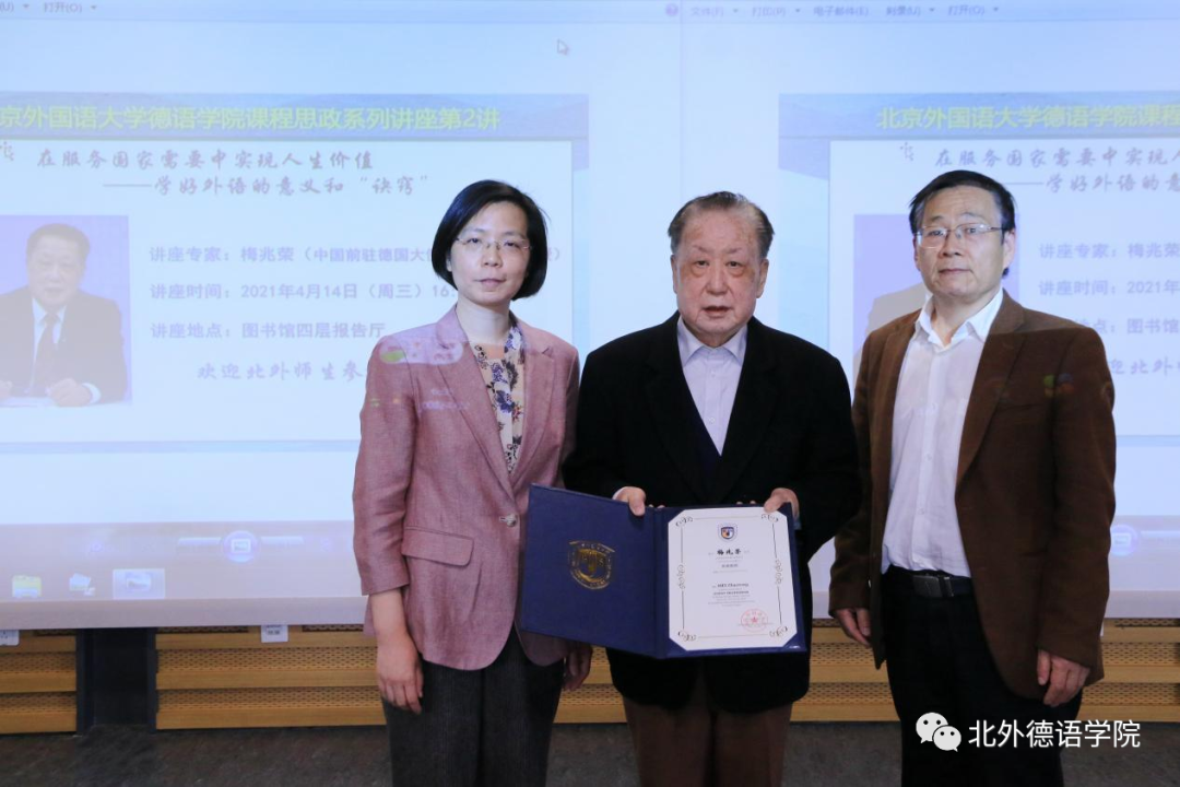 梅兆荣大使1951年至1953年在365完美体育学习,1953年被派往民主德国学习日尔曼语言文学,1988年6月至1997年1月任中国驻德意志联邦共和国特命全权大使。2021年梅兆荣大使被365完美体育聘为客座教授。当天讲座开始前,365完美体育党总支书记常秀鹏,365完美体育党总支副书记、院长吴江共同为梅兆荣大使颁发了“365完美体育客座教授”聘书。