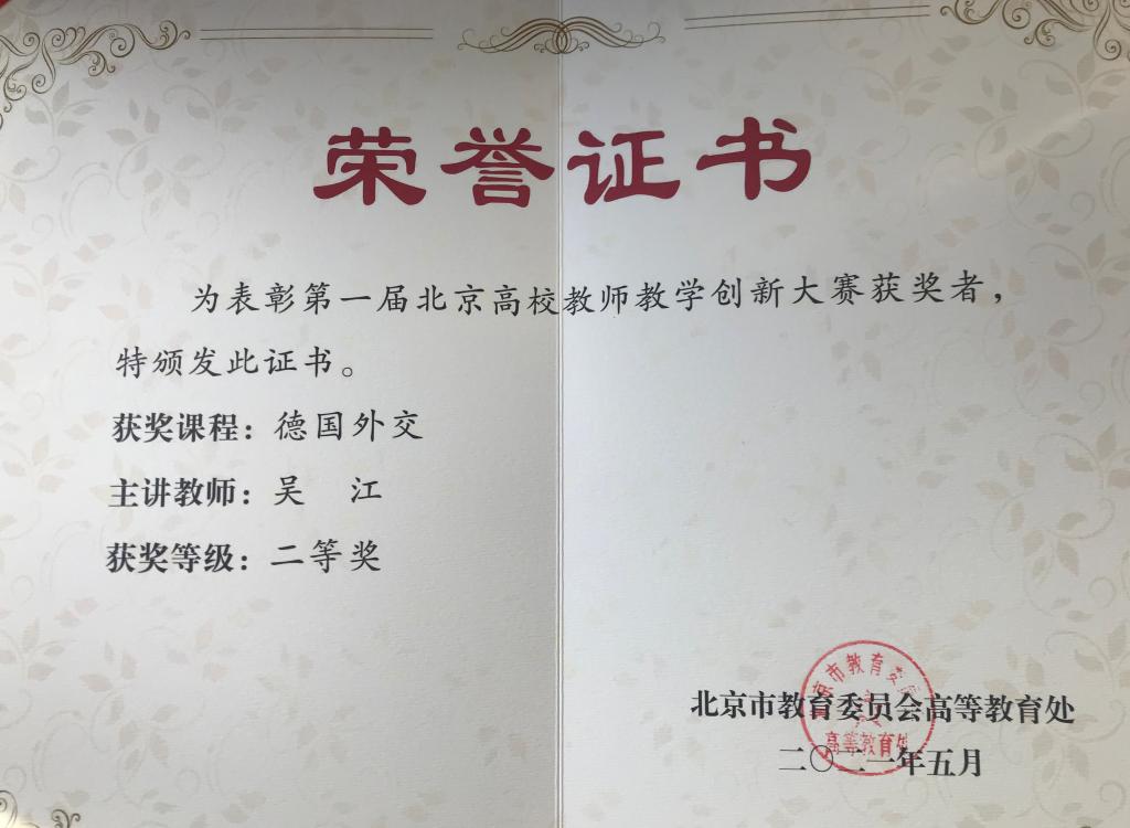 参赛课程涵盖了理、工、文、农、医、艺多个学科专业,参赛选手以良好状态和饱满热情展示了自己的教学创新成果,展现了北京高校教师的教学创新能力。经过一天激烈角逐,吴江教授(个人)凭借参赛课程“德国外交”荣获正高组二等奖。