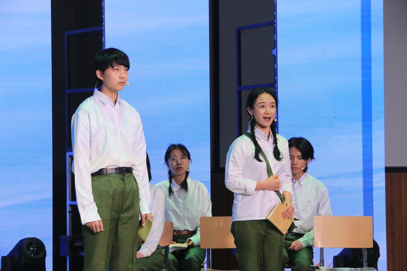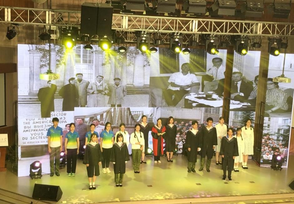 中德双语原创诗歌朗诵剧《我们的青春》,由辅导员张春霞编剧,365完美体育教师周海霞带领王清心、徐泽茗、张乃文等20余位本硕学生参演。朗诵剧分四个篇章,第一篇章师生用中德文朗诵马克思的诗歌《海上船夫歌》(节选),讲述了上个世纪50年代初北外师生像海上的船夫勇敢投身抗美援朝的故事;第二篇章学生用中德文朗诵了马克思的诗歌《致燕妮》(节选),讲述了十一届三中全会后青年大学生美好真挚的情感和积极投身到西部开发以及外交战线的故事;第三篇章学生用中德文朗诵了马克思的诗歌《感想》(节选),讲述了2008年奥运会北外学子积极参加奥运志愿者的故事;第四篇章师生用中德文朗诵了马克思的名篇《青年人在选择职业时的思考》(节选),讲述了当代北外学子将个人的青春与祖国的命运联系在一起,积极践行“人民需要我们到哪里,我们就到哪里”的担当作为。