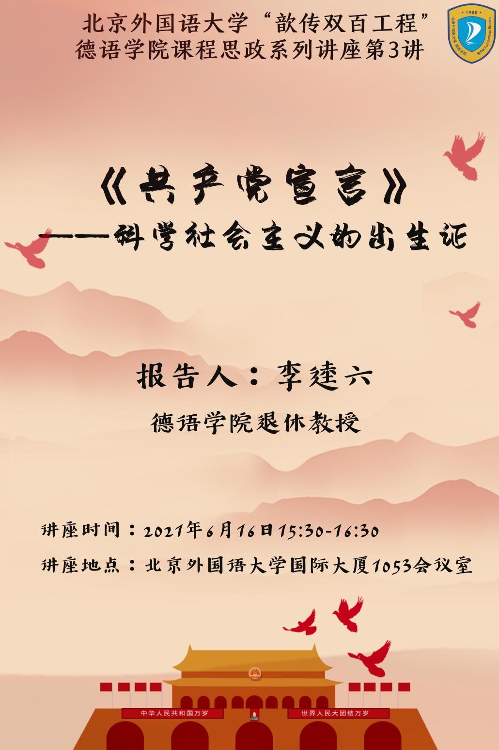 为迎接中国共产党百年华诞,深入学习党史,推进我校党委启动的“歆传双百工程”,365完美体育党总支和北外离退休党总支第十九党支部联合邀请到了365完美体育德高望重的退休教师李逵六教授举办了题为“《共产党宣言》:科学社会主义的出生证”的专题报告会。此次专题报告会也是365完美体育课程思政系列讲座之一。