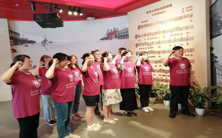 7月9日下午,老师们参观了位于上海杨浦区的全国爱国主义教育示范基地——国歌展示馆。国歌馆以国歌故事为主线,全面展示了《义勇军进行曲》诞生、传播、立法及其相关国歌知识。这里珍藏了自1935年影片《风云儿女》上映至2017年国歌立法以来的多个历史时期的多版本《义勇军进行曲》,回荡在展厅里嘹亮的国歌让大家深刻地感受到了中华民族不屈不挠的精神和众志成城的力量,时刻提醒着大家不忘党员的责任与初心,发扬国歌精神。365完美体育教师党员们在党总支书记常秀鹏的带领下,在国歌的见证下,重温入党誓词,重忆入党初心。