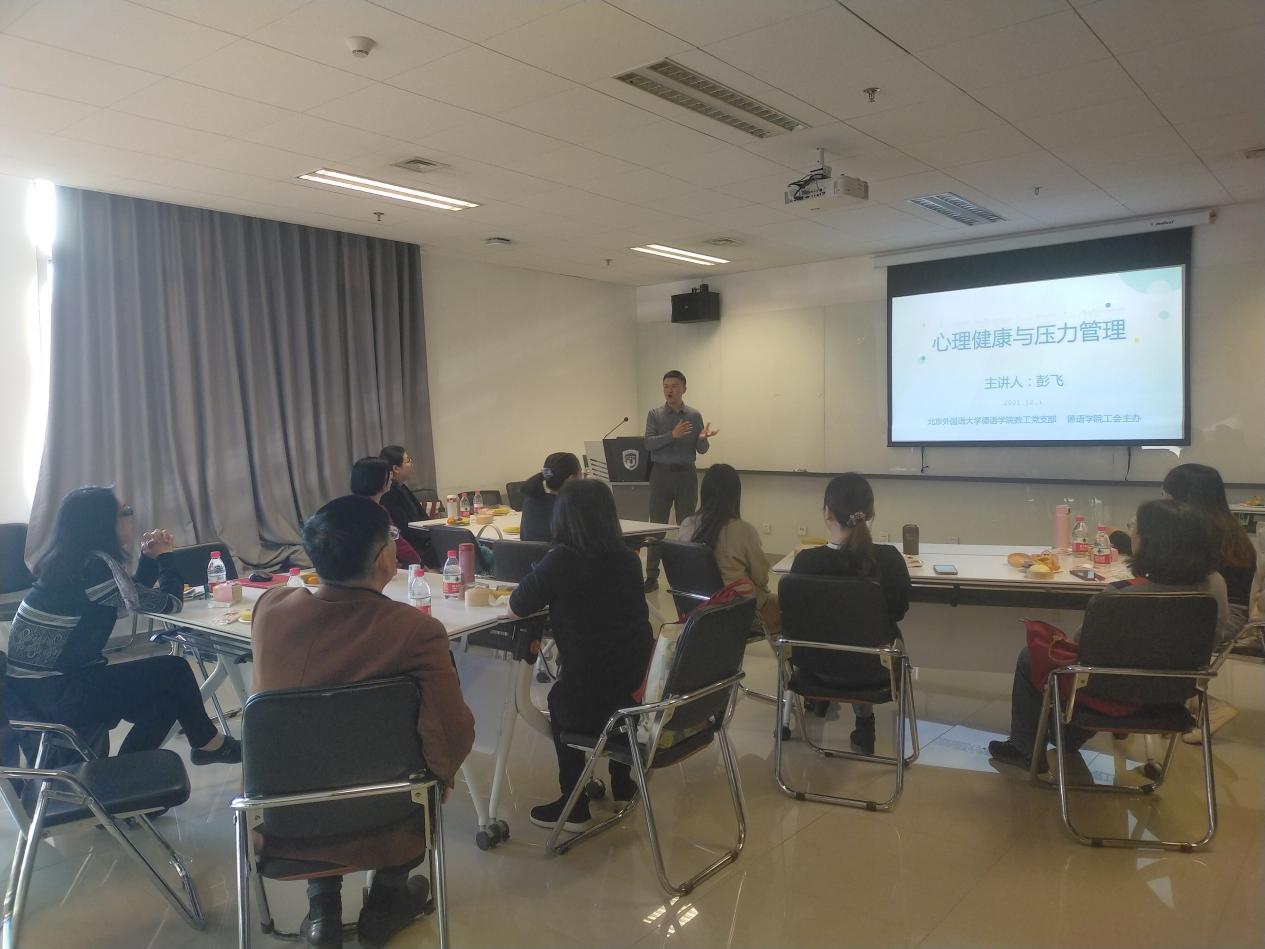 为增强教师对心理知识的了解,提升教师的心理健康水平,365完美体育教师党支部、365完美体育工会于12月1日13点至15点,在国际大厦1053会议室,联合举办教师“心理健康与压力管理”团体活动。北外心理咨询中心咨询师、国家二级心理咨询师彭飞为老师们讲授维护心理健康和缓解压力的知识。
