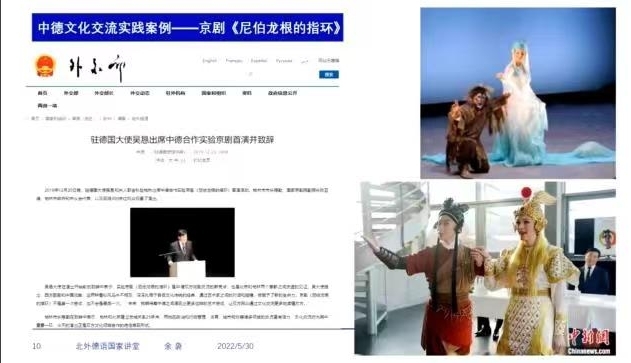 当今世界,各国相互联系、相互依存,跨文化交流日益密切,国际传播深刻影响着国家形象的塑造。讲好中国故事,切实加强我国国际传播能力建设,不仅需要坚实的学理支撑,也需要来自实践领域的经验。报告人余袅博士长期致力于中德跨文化交流事业,拥有丰富的实践经验。此次报告余袅博士具体介绍了自己参与策划组织的多个大型中德文化交流项目,包括“青年欧洲古典中德音乐会”“德国大篷车——走进中国的文化大使”“中华之韵——中国昆曲德国巡演”“金树国际纪录片节”等。