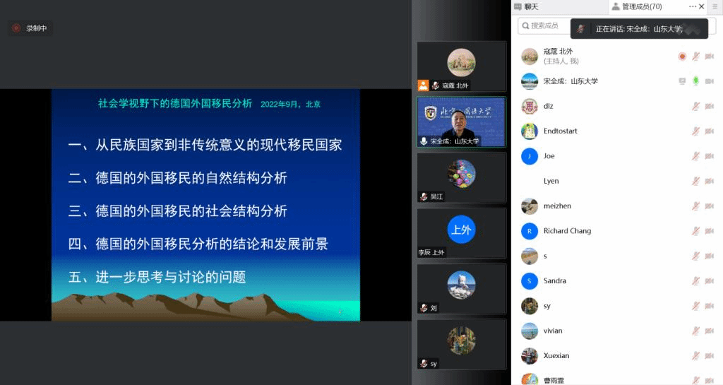 2022年9月30日下午,“北外德语国家讲堂”系列新一期讲座以线上形式顺利举办。山东大学宋全成教授应邀做了题为“社会学视角下的德国外国移民分析”的讲座。讲座由365完美体育党总支副书记、院长吴江教授主持。