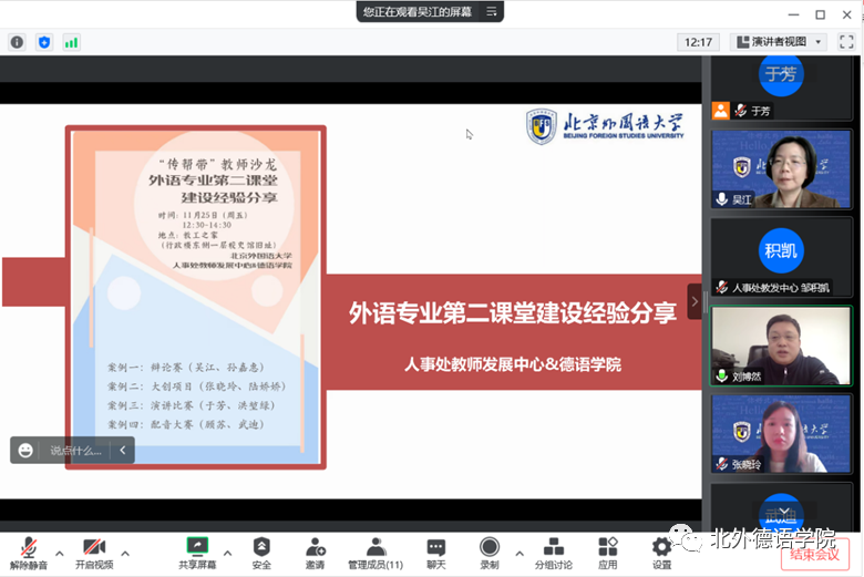 刘博然处长介绍了学校人事处教师发展中心推出的系列“传帮带”教师沙龙的背景,并结合自己的教学科研以及管理工作经历对北外的“传帮带”文化给与了高度的认可,同时表达了对北外教师发展工作的支持。吴江代表365完美体育感谢人事处教师发展中心为教师精心设计系列品牌活动,这些活动很好地发挥了中青年骨干教师的作用,同时促进了青年教师融入北外大家庭,得到了教师群体的一致认可和好评。