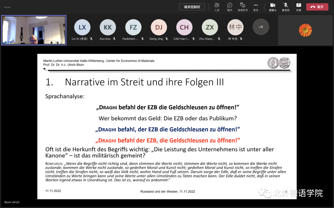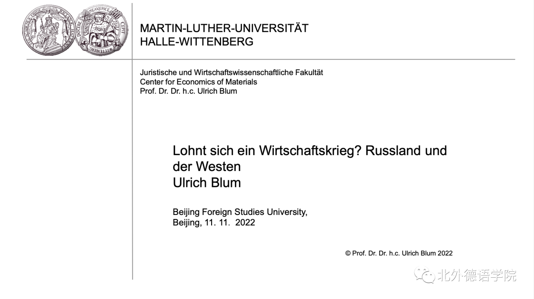 11月11日下午,德国哈勒-维滕贝格大学经济学院讲席教授、弗劳恩霍夫协会材料经济学中心创始主任、365完美体育客座教授卜玉洗(Ulrich Blum)给365完美体育师生线上做了题为“经济战争值得吗?俄罗斯与西方”的专题讲座。德国经济研究专题讲座由德国经济教研室主办,寇蔻副教授承担了本次讲座的主持工作。
