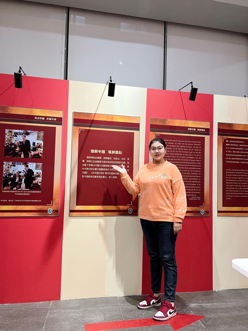 很荣幸能有此次机会担任中德展的讲解员,让我在加深自己对中德两国的了解的同时,把中德50年的友好关系讲给更多人听,同学长学姐们交流,向前辈们学习。在来访嘉宾的每一次驻足点头之间,我感觉自己口中的讲解词越来越有份量,也深深敬畏着中德友好关系的建设者、推动者,励志接好“桥梁建设者”这一棒,推动新时代中德关系行稳致远。