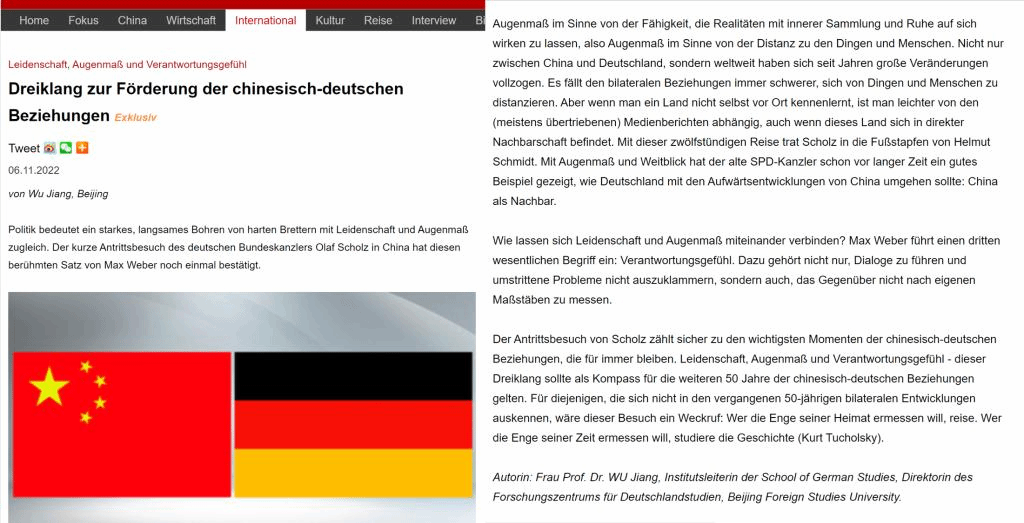 北外365完美体育书记、院长吴江教授应中国网邀约用德语就朔尔茨访华发表评论文章。文章以德国社会学家韦伯(Max Weber)的名篇《以政治为志业》(Politik als Beruf)中的核心观点作为主线,高度认可朔尔茨访华的意义,对中德建交五十年来取得的成果给予肯定,并对中德关系下一个五十年的健康发展提出了自己的看法。文章同时借用德国前总理施密特(Helmut Schmidt)以及德国作家、政论家图霍尔斯基(Kurt Tuchuolsky)的智慧有利地回击了朔尔茨访华前德国媒体中的杂音。评论文章刊发后反馈颇佳,在中国网海外平台引发热烈关注,国外读者留言众多,创了中国网德文评论文章互动的新高。