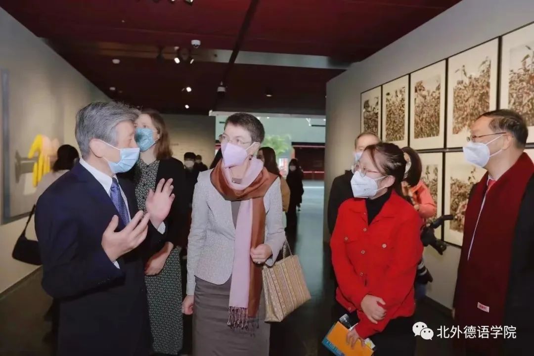 在雕塑作品中,傅融大使对任戎的大型系列雕塑“创世纪”、张国龙的“极地生花”非常感兴趣。范院长给傅融大使讲了传统文化中关于凤凰的浴火重生的传说,傅融大使听后非常兴奋,她说在德国恰恰有类似的传说,它每过一百年就把自己在巢里烧死一次。不过每次总有一个新的凤凰——世界上唯一的凤凰——从那个红蛋里飞出来。范院长听后也非常高兴,他第一次听到德国关于凤凰的童话,并表示这就是跨文化交流的魅力。在装置作品中,傅融大使对李继伟的“基因系列”与“关系”作品很有兴趣,她觉得灯光艺术很有趣,并和范院长讲到自己的祖父也是做灯光艺术的艺术家,因此她对灯光艺术非常熟悉。又如冯陆的作品“潘佳”,傅融大使说这是一只有勇气的肥猫。在新媒体艺术中,如缪晓春的“RESTART”中,采用3D建模的手法把平面形象转换成立体艺术。在屏幕前,傅融大使认真观看动画,并指出从中可以看出西方教堂和东方青花瓷的元素。范院长说中德艺术的互译性特征之二是两者的工匠精神,在吸收借鉴了德国包豪斯设计理念,旅德中国艺术家在其设计作品中思考如何更好地将中国传统文化元素与现代设计理念相融合。傅融大使仔细观看了由林存真与其团队设计的2022北京冬奥会系列作品,她尤其对冬奥会的会徽设计很感兴趣。在听完设计师关于冬奥会会徽设计思路的讲解,傅融大使觉得一个融合了汉字“冬”与“飞”的设计实在精妙。最后,范院长向傅融大使提出关于加强中德艺术设计与建筑方面的合作意向,傅大使表示将对此全力支持。