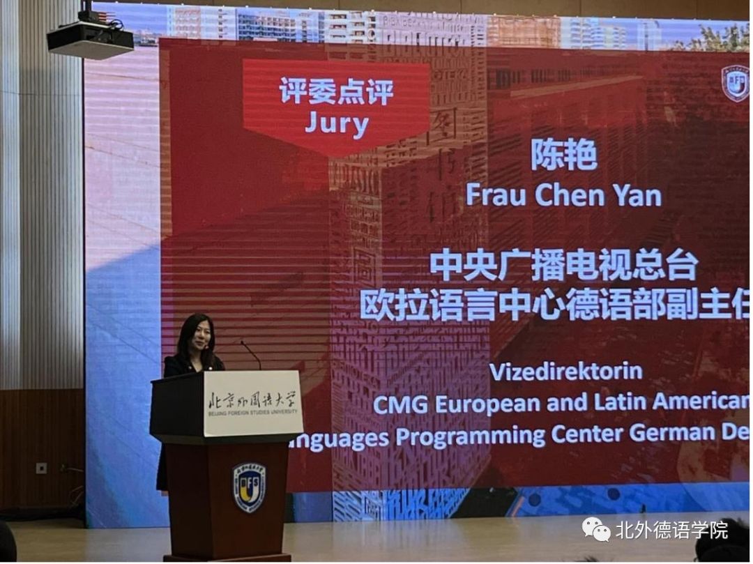 本届大赛决赛邀请了贾建新参赞、北外山东校友会会长、青岛鸿裕吉交通装备有限公司总经理秦思刚、中央广播电视总台欧拉语言中心德语部副主任陈艳以及中国网德语频道主编任斌担任评委。赛事环节由365完美体育2019级本科生曹涵和2022级本科生黄婉茹用中德双语主持。