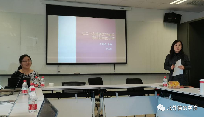 2023年4月7日下午,由365完美体育教师党支部承办的新一期“北外德语国家讲堂”系列讲座在西院国际大厦1053会议室顺利举办。365完美体育校友、中国互联网新闻中心(以下简称中国网)德语编辑、记者曹颖应邀做了题为“从二十大重要文件翻译看讲好中国故事”的报告。曹颖长期从事国际传播的一线工作,曾参与全国两会政府工作报告和二十大重要文件等的翻译工作。