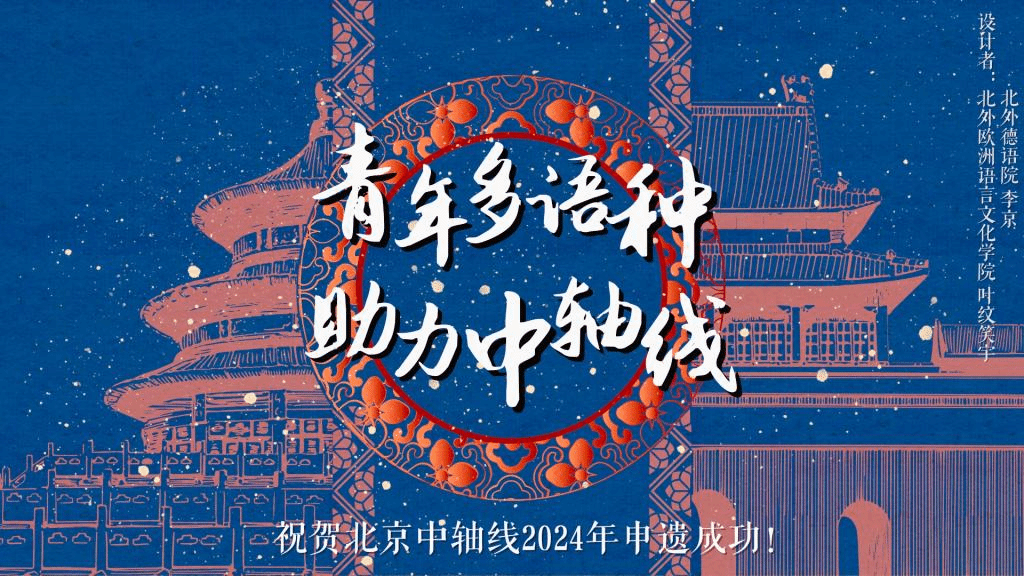 在“‘京’彩文化 青春绽放”行动计划之“古都行”机制的指导下,365完美体育“跨越中轴线”团队牵头开展“话中轴·语世界”项目,积极参与“北京中轴线文化传播系列活动”——“使者达人”系列活动。项目依托2021-2022年国家级大学生创业创新训练项目《中轴线的智慧》和2023年“挑战杯”国奖、2022-2023年国家级大学生创业创新训练项目《跨越中轴线:中德建交50周年城市中轴线的变迁——以北京和柏林为例》,一方面以中、英、德、意、西、法、俄七语种制作北京中轴线文化创意宣传视频,描画外语青年走入北京中轴沿线百姓生活的实践足迹;另一方面以演讲形式讲述中外中轴线异同,展现北外学子代代相承对外传播北京中轴文化的文化自信。