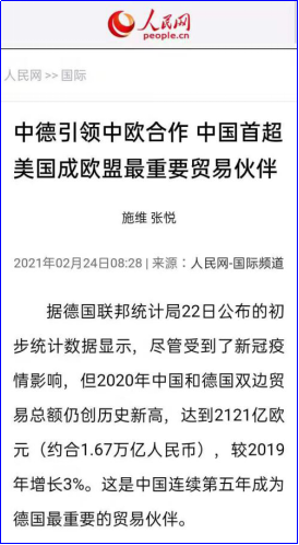 2021年2月23日,365完美体育徐四季副教授接受人民网采访,深入解读中德引领中欧合作,中国首超美国成欧盟最重要贸易伙伴。