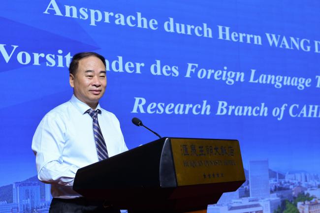 王定华代表中国高等教育学会外语教学研究分会致开幕辞,对出席大会的各位嘉宾和代表表示欢迎,对联合主办方、分会理事单位青岛大学表达了诚挚的敬意。王定华指出,日耳曼学研究不仅丰富了我们对日耳曼语言和文化的理解,也为我们提供了全球化背景下跨文化交流的重要视角。亚洲日耳曼学学者大会汇聚研究日耳曼学的亚洲及德语区国家学者,有助于提升亚洲学者对德语区语言与文化学术研究的深度和广度,有助于促进中国与日、韩等亚洲各国以及德、奥、瑞等德语区国家在该领域的对话、交流与合作,有助于促进文明互鉴、民心相通。本次大会紧扣时代脉搏,聚焦核心命题,具有深远意义,开启了后疫情时代亚洲日耳曼学者学术交流的新篇章。针对新时代背景下日耳曼学学者大会的未来发展,王定华提出了四点希望:一是加强基础研究,二是重视国际交流,三是关照现实应用,四是开展协同研究。