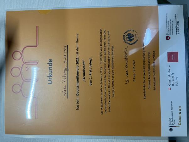 近日,由德国、奥地利和瑞士驻华大使馆联合主办的2022德语大赛圆满落幕。此次大赛以“友谊”为主题,来自全国各地近700名青少年德语学习者提交了短篇故事或漫画作品参赛。经过专业评审团的打分,365完美体育2021级本科生刘禹彤的参赛作品“Anna und das Vöglein”凭借扎实的语言功底以及丰富的想象力获短篇故事类一等奖。