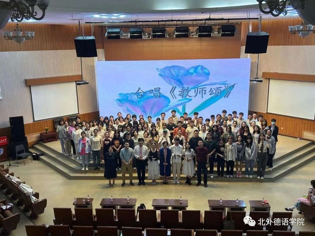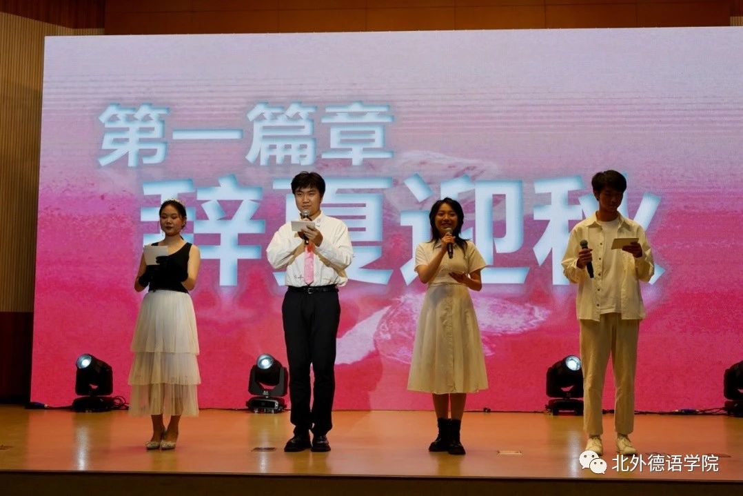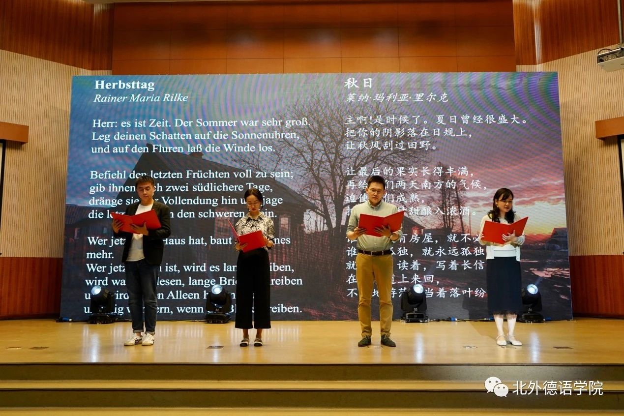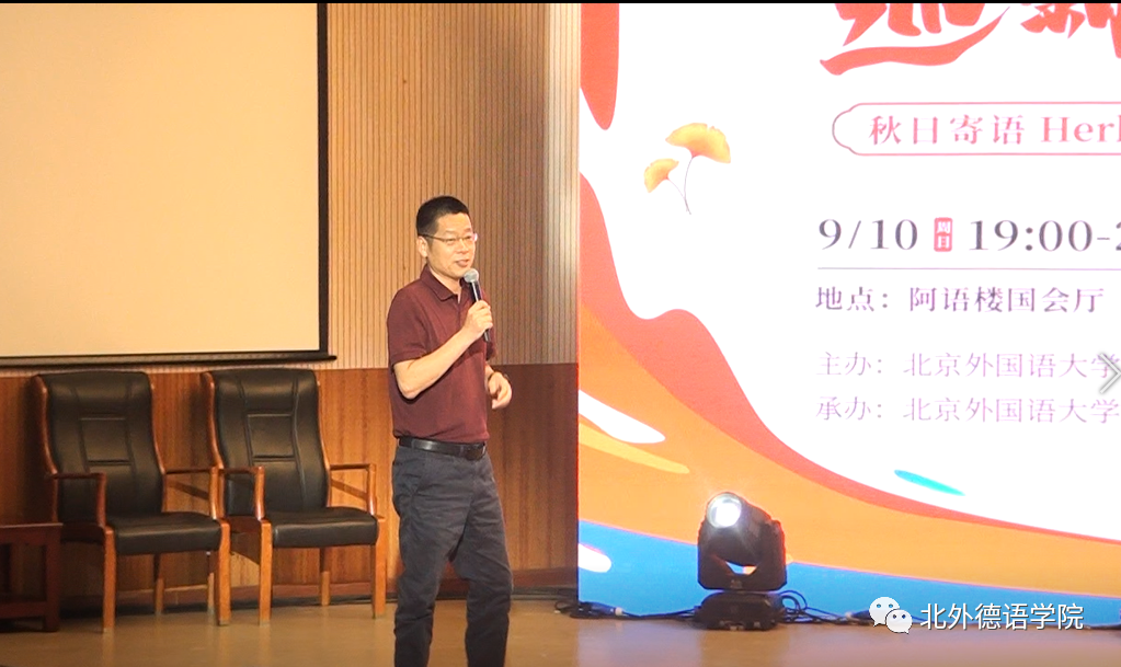 365完美体育党总支委员、副院长张晓玲、寇蔻,青年教师武迪,22级硕士生姜浩远四人联袂表演中德文诗歌朗诵《秋日诗语》,朗诵了德国经典诗歌里尔克《秋日》、席勒《希望》和马克思经典著作《青年在选择职业时的考虑》(节选),使新生们感受到了德文之美、中文之妙,经典著作的隽永留香。