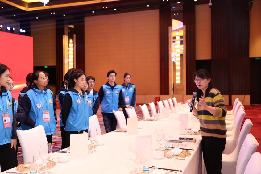 还有一对因连接不上宴会厅的Wi-Fi而犯愁的南非姐妹。当时,服务员阿姨急匆匆找到我,说那边有一桌外国人有点事,非要找我们这些穿蓝色马甲的志愿者解决。我快步走去了解事由后,马上就帮她们解决了Wi-Fi连接出错的问题。那对南非姐妹兴奋极了,问我“How to say darlingand thanksin Chinese”,我也就这样收到了南非友人们的好几句“亲爱的,谢谢”。
