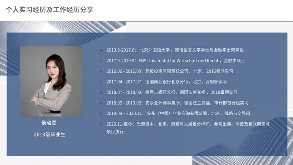 首先分享的是侯璐雯学姐。侯璐雯学姐向大家介绍了自己目前在投行的具体工作内容、当初选择金融行业的原因以及相关实习经历,并与学弟学妹分享了自己心态的变化以及工作后的点滴感悟。学姐指出,在如今竞争激烈的社会大环境下大家不必过分焦虑,身心健康才是最重要的。学姐还鼓励大家去寻找自己真正感兴趣并热爱的事情,保持一颗赤子之心。