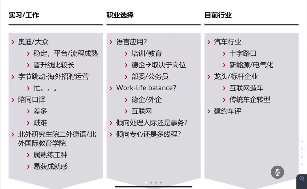 分享环节结束后,同学们就感兴趣的领域向学姐踊跃提问,问题涉及车企具体工作内容、内部转岗、找实习和工作的途径、德语专业对口岗位等多个方面。学姐们耐心细致地为大家解答了问题,并分享了宝贵的经验与建议。