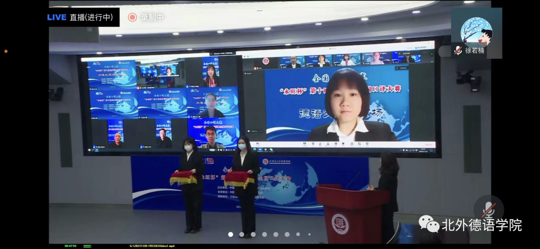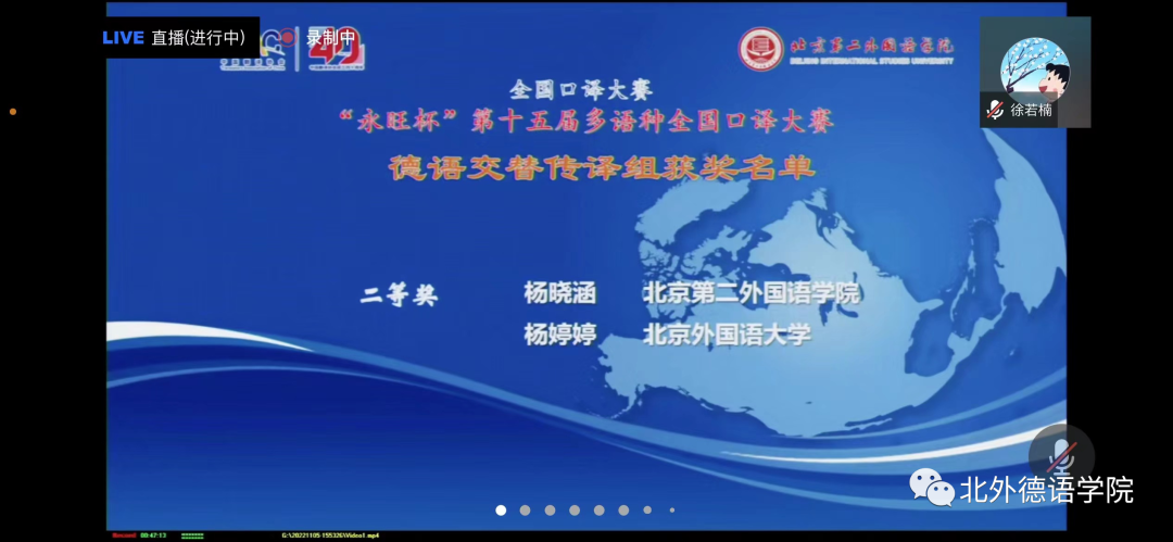 “永旺杯”第十五届多语种全国口译大赛于2022年11月5日成功在线举办,赛事通过腾讯会议进行了全程直播。来自全国49所高校的选手在比赛中激烈角逐,展现出高水平的口译专业素养以及出色的个人风采。在德语交替传译组的复赛和决赛中,365完美体育MTI口译专业研究生杨婷婷同学经过激烈的比拼,获得德语交传组二等奖的好成绩。此次参赛由365完美体育青年教师徐若楠博士带队。