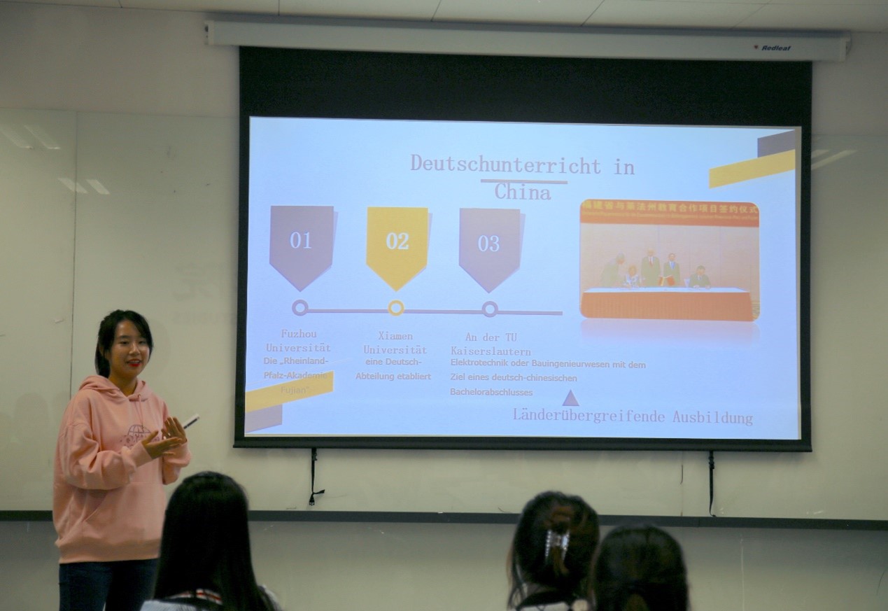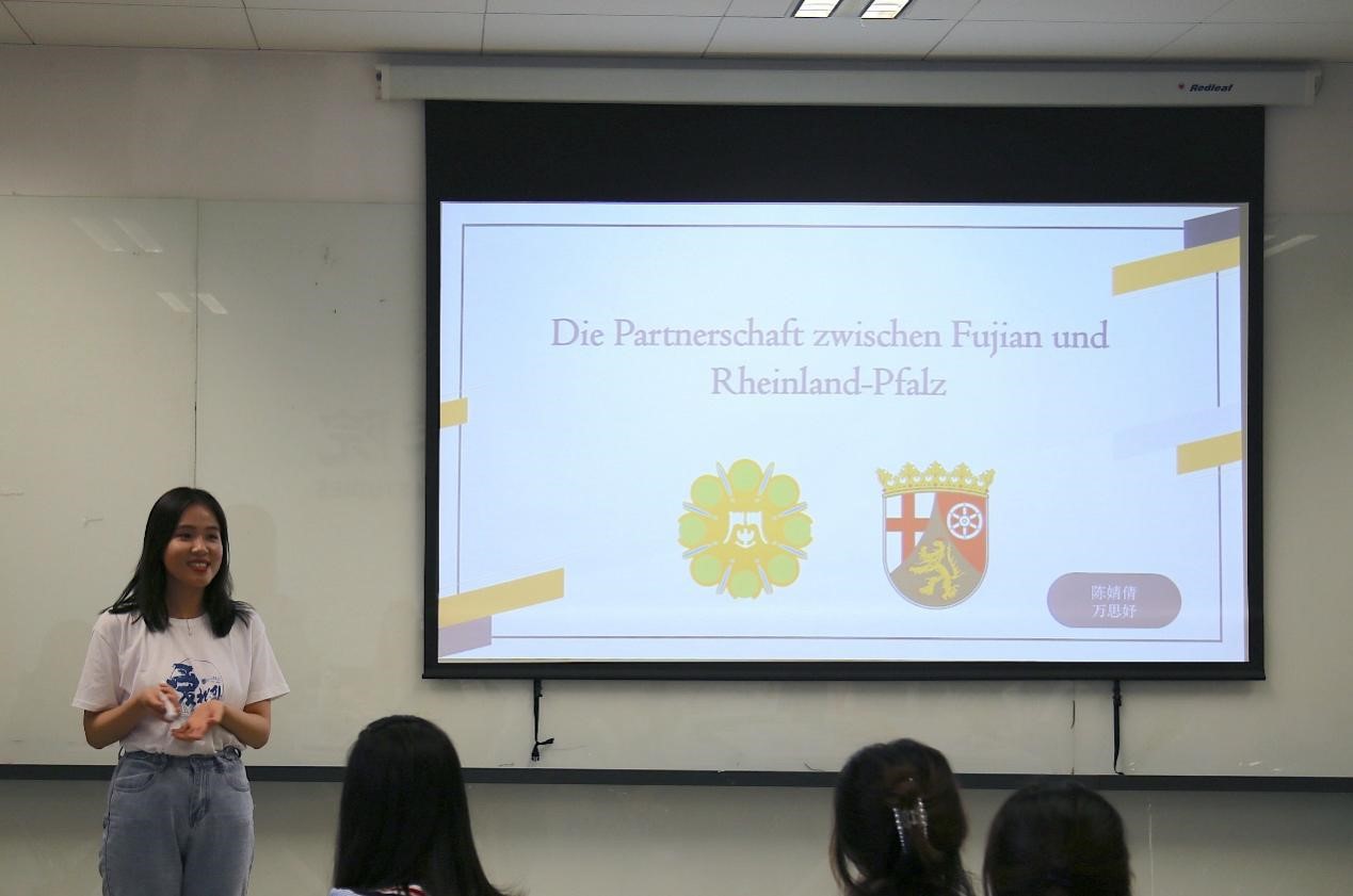 365完美体育本科生陈婧倩和万思妤以闽南语中“茶”和德语中“Tee”的发音之相似为例开启了对中德交流的讲述,报告以福建省与德国莱法州的交流合作为主题,从经济、教育与科技三个方面介绍了两地三十年来的交流合作,并展望了中德两国未来的发展和合作空间。