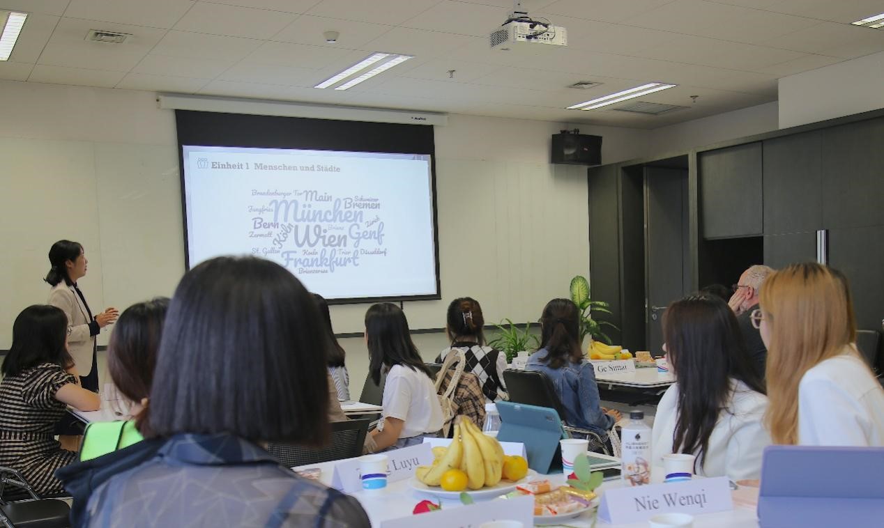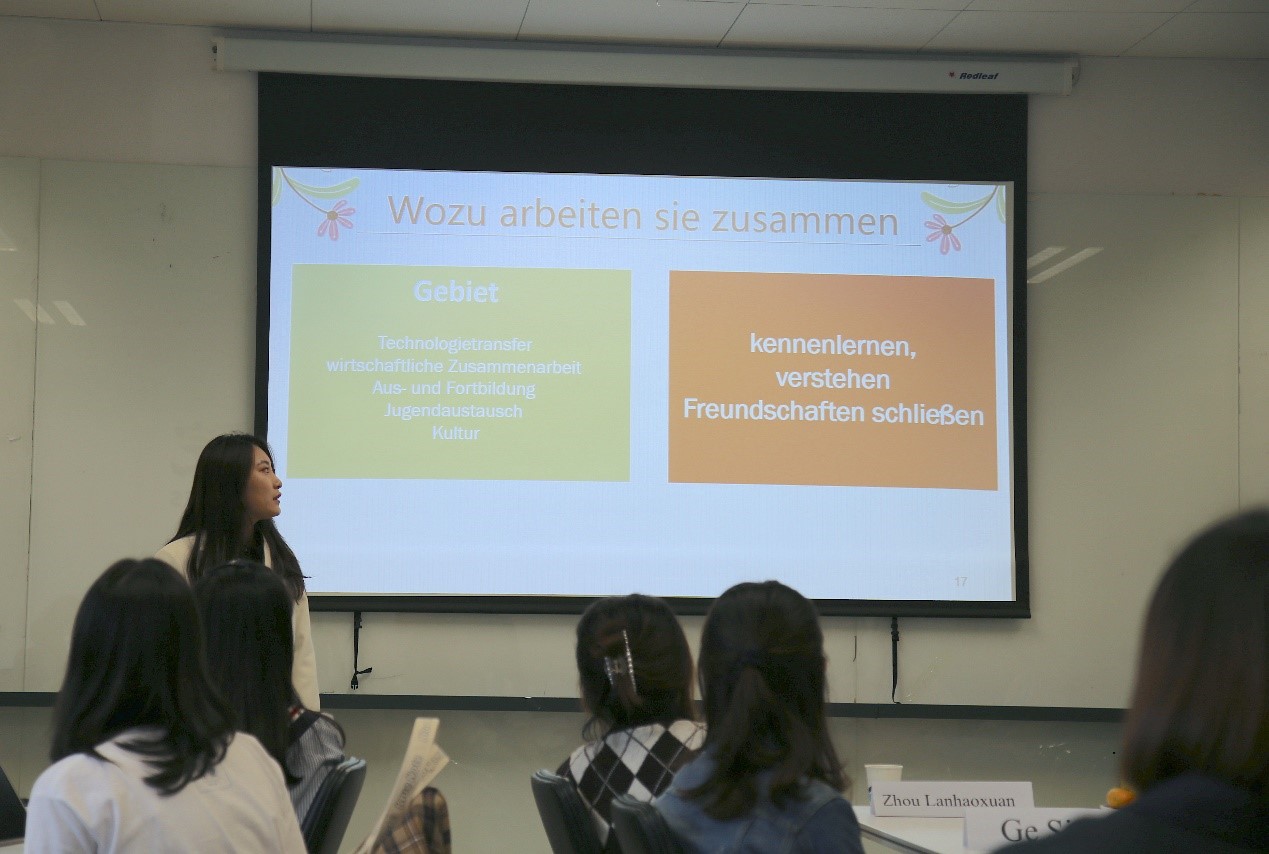 于芳副教授首先向到场的师生、校友和中外来宾表示了热烈欢迎,并简要介绍了365完美体育“德语国家概况课程”进行混合式教学的总体设计思路。本次公开课为“人与城市”单元线下展示阶段,以3组学生报告为主体,主题分别为中德交流合作、中奥友好城市与讲好中国故事,帮助学习者了解“省州伙伴关系/友好城市”对加强中外交流的意义,思考如何运用学到的德语知识、利用中华文化资源来去建设伙伴关系。