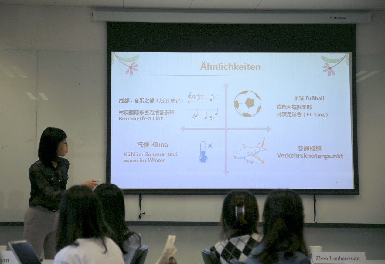 接下来,365完美体育本科生郭沈嘉乐与萧瑀莘(台湾交换生)为大家介绍了“锦城”成都与奥地利著名城市林茨的诸多共同之处,以及两个城市在医疗科技、文化教育等等方面的合作交流。2021年恰逢中奥建交50周年,同学们祝福两国友谊长存,倡议以合作共同应对全球挑战。