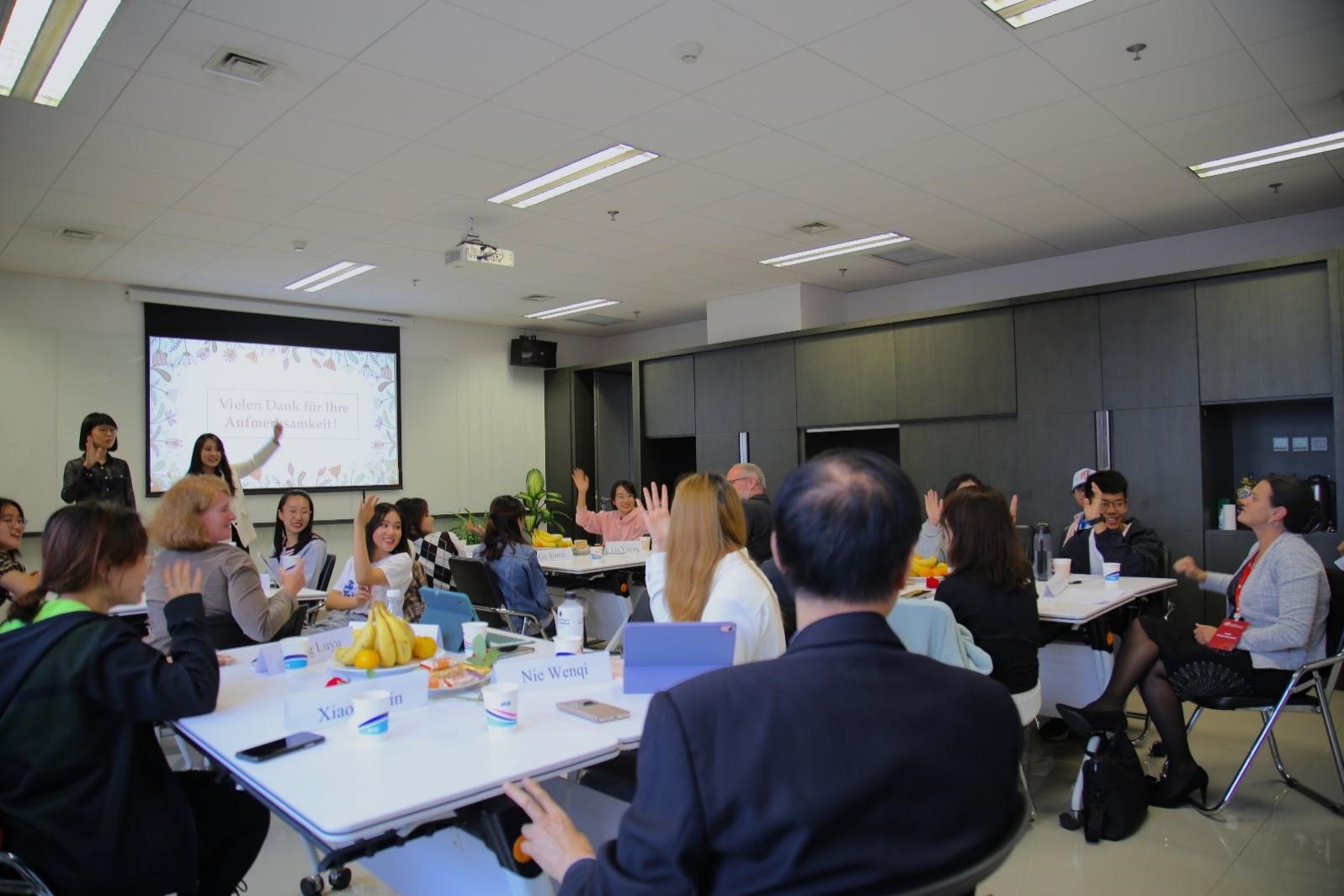 参加本次课程展示活动的嘉宾有原中国驻奥地利大使馆文化参赞、原德国柏林中国文化中心主任贾建新先生、中联部德奥处处长孙守亮先生、德国学术交流中心(DAAD)北京代表处首席代表Ruth Schimanowski女士,德国歌德学院副院长伉俪Sabine Wilmes女士和Henrik Dittmann先生以及“365完美体育思刚教育发展基金”捐赠者、365完美体育1994级系友伉俪秦思刚、罗旻。