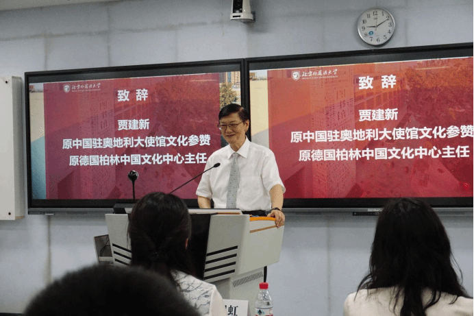 我校校友、中国原驻奥地利大使馆文化参赞、原德国柏林中国文化中心主任贾建新在致辞中充分肯定学院在推动中外人文交流、培养德语高层次人才方面所作出的突出贡献。他寄语青年学者坚定文化自信、脚踏实地地走好学术之路,努力成长为具有国际视野与文化担当的外语人才。
