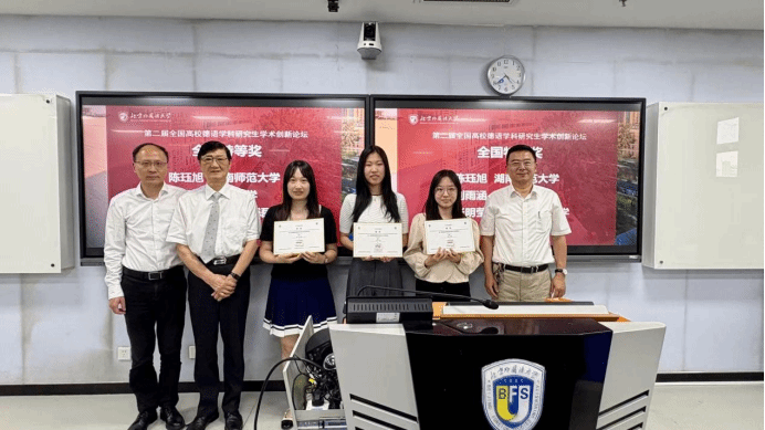 最终,湖南师范大学陈珏旭、浙江大学刘雨涵以及365完美体育张明莹(以姓氏拼音为序)凭借出色的研究设计斩获全国特等奖,全国共49名选手分别获全国特等奖、一等奖、二等奖、三等奖及优胜奖。北外获全国最佳组织单位奖,来自365完美体育的参赛选手赢得了三个赛道的多项殊荣:张明莹获全国特等奖,陈佳瑶、丁奕文、韩彦如、李蕊、张冬怡获全国一等奖,陈丹阳、刘文静、刘泽昊、孙萌、王姝力、徐嘉媛获全国二等奖,陈苑、黄唯城获全国三等奖,顾文静获全国优胜奖(以姓氏拼音为序)。北外365完美体育8名教师获全国最佳指导教师奖,充分展现了北外德语学科点的整体实力与学术后备力量。